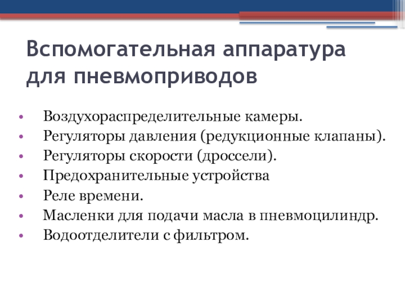 Слайд 19Вспомогательная аппаратура для пневмоприводов