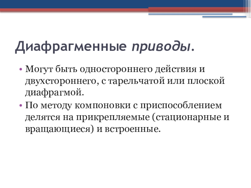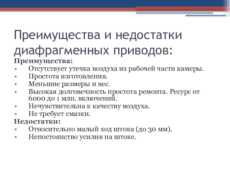Слайд 18Преимущества и недостатки диафрагменных приводов: