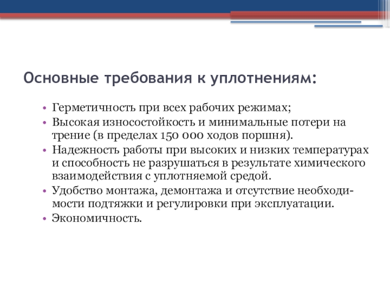Надежность работы при высоких и низких температурах и способность не разрушаться в результате химического взаимодействия с уплотняемой средой.