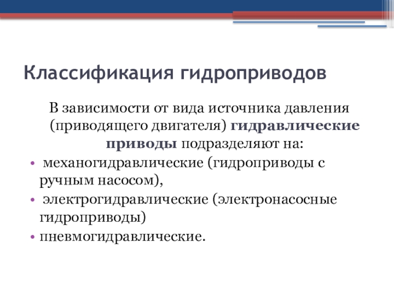 В зависимости от вида источника давления (приводящего двигателя) гидравлические приводы