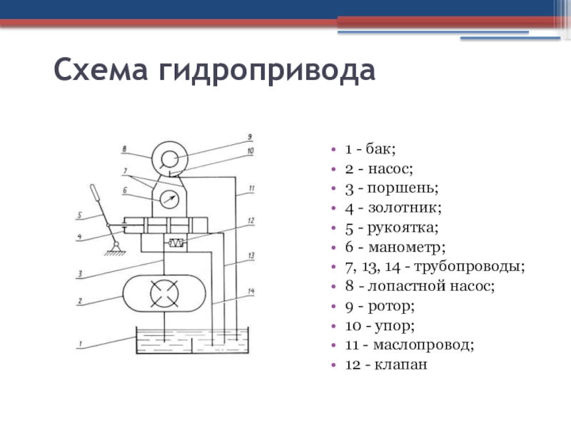 рабочего цилиндра, насоса для подачи масла в цилиндр, бака для масла, аппаратуры управления и регулирования и трубопроводов.