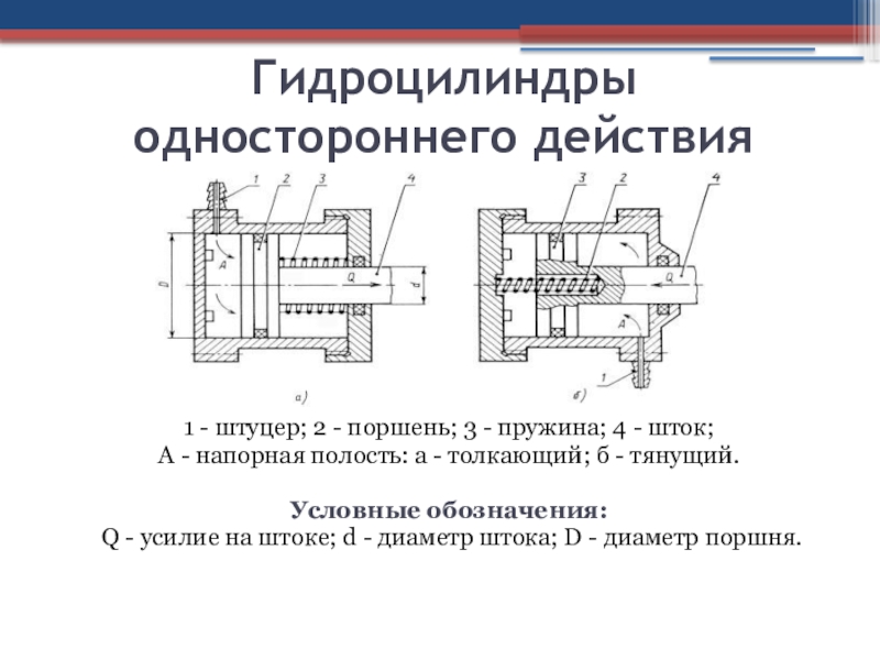 Q - усилие на штоке; d - диаметр штока; D - диаметр поршня.