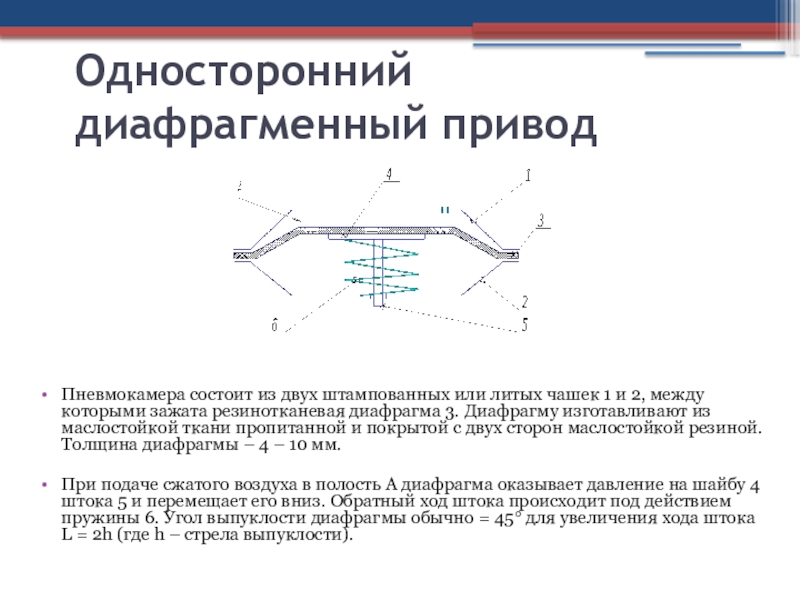 При подаче сжатого воздуха в полость А диафрагма оказывает давление на шайбу 4 штока 5 и перемещает его вниз. Обратный ход штока происходит под действием пружины 6. Угол выпуклости диафрагмы обычно = 45 для увеличения хода штока L = 2h (где h – стрела выпуклости).