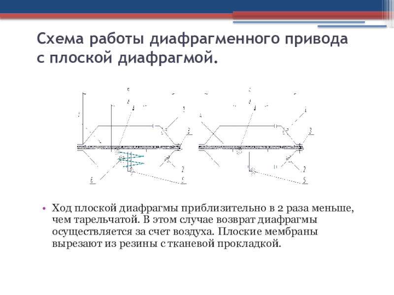 Слайд 16Схема работы диафрагменного привода с плоской диафрагмой.
