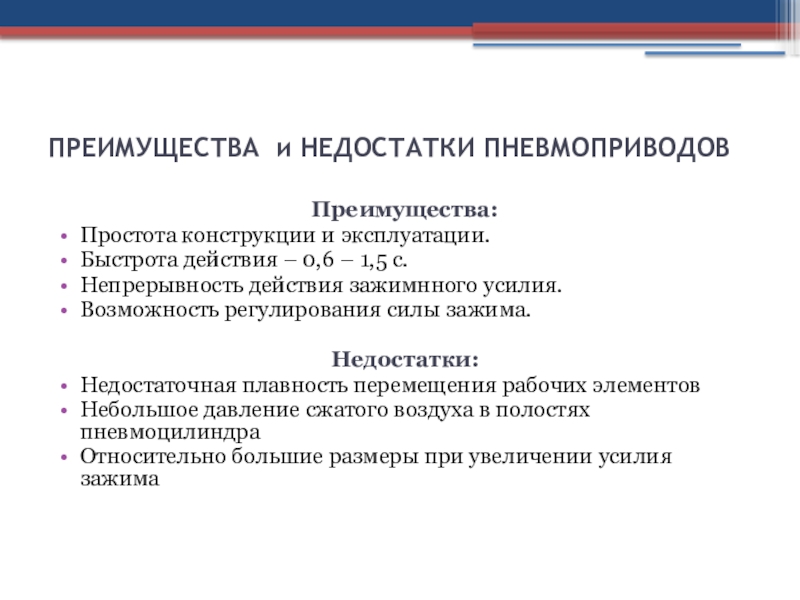 Слайд 4ПРЕИМУЩЕСТВА и НЕДОСТАТКИ ПНЕВМОПРИВОДОВ