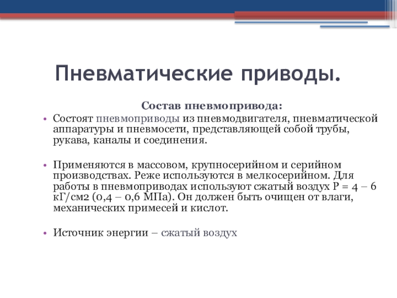 Применяются в массовом, крупносерийном и серийном производствах. Реже используются в мелкосерийном. Для работы в пневмоприводах используют сжатый воздух Р = 4 – 6 кГ/см2 (0,4 – 0,6 МПа). Он должен быть очищен от влаги, механических примесей и кислот.