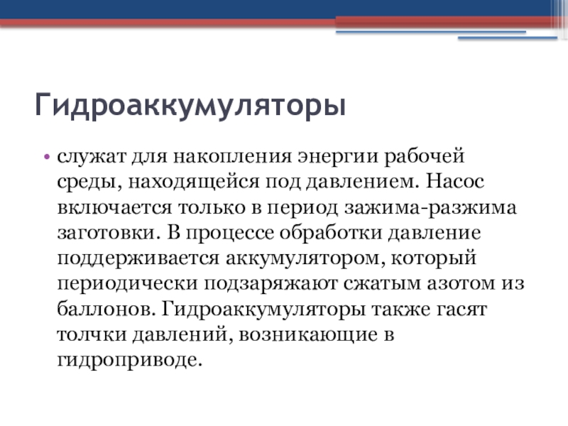 только в период зажима-разжима заготовки. В процессе обработки давление поддерживается аккумулятором, который периодически подзаряжают сжатым азотом из баллонов. Гидроаккумуляторы также гасят толчки давлений, возникающие в гидроприводе.