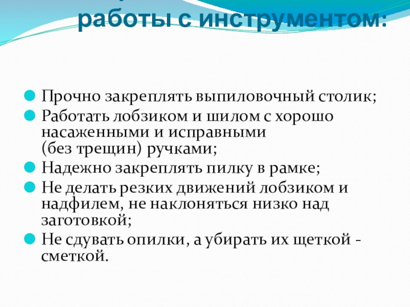 Правила безопасной работы с инструментом: Прочно закреплять выпиловочный столик;Работать лобзиком и шилом с хорошо насаженными и исправными