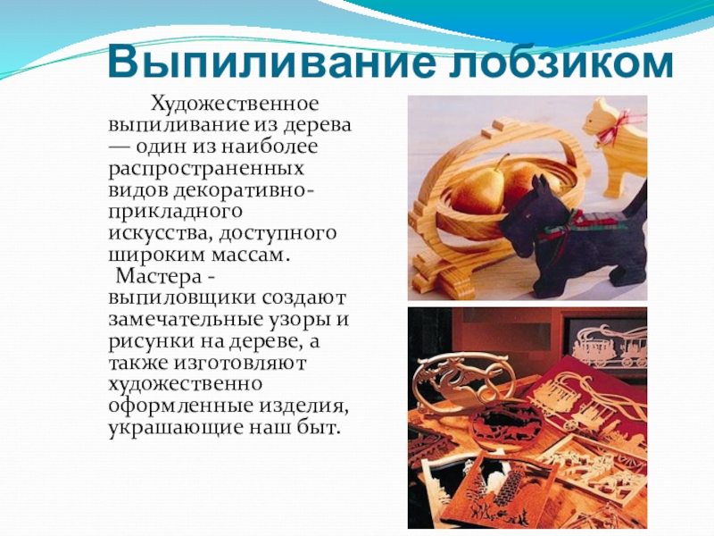 Выпиливание лобзиком		Художественное выпиливание из дерева — один из наиболее распространенных видов декоративно-прикладного искусства, доступного широким массам.