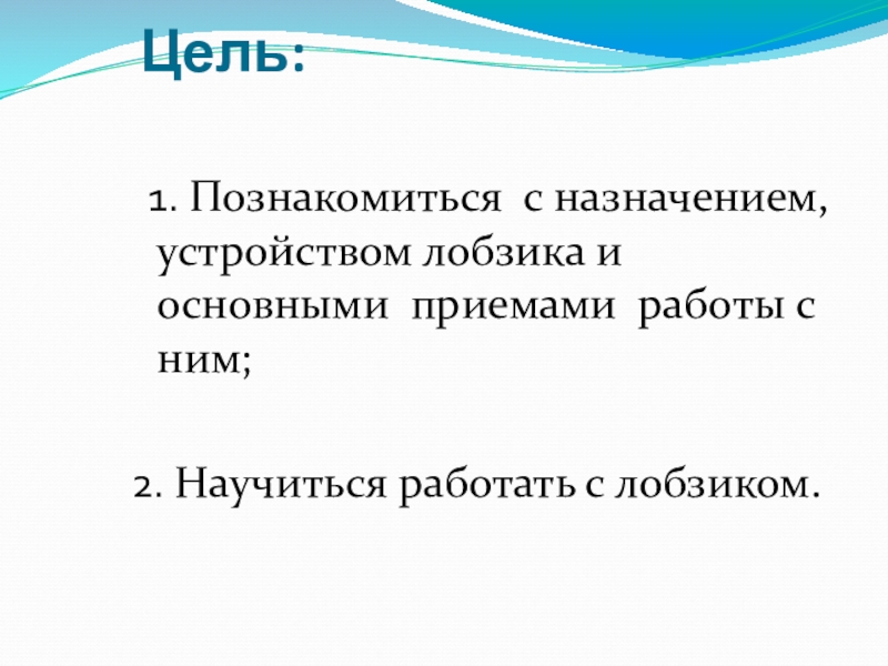 Цель:   1. Познакомиться с назначением, устройством лобзика и основными приемами работы с ним;2. Научиться