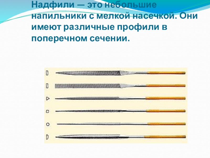 Слайд 6Надфили — это небольшие напильники с мелкой насечкой. Они имеют различные