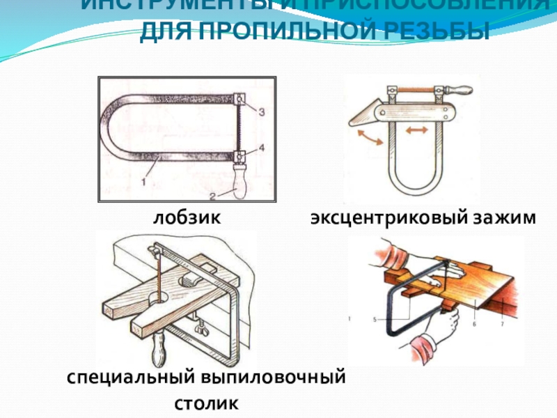 ИНСТРУМЕНТЫ И ПРИСПОСОБЛЕНИЯ ДЛЯ ПРОПИЛЬНОЙ РЕЗЬБЫ лобзикэксцентриковый зажимспециальный выпиловочный столик