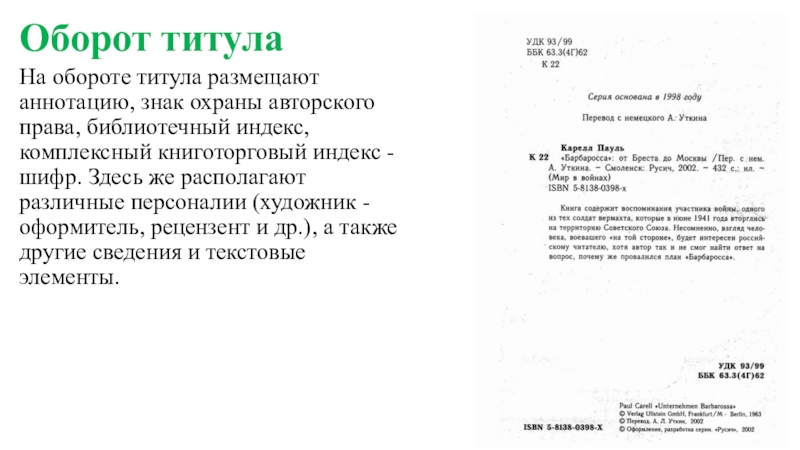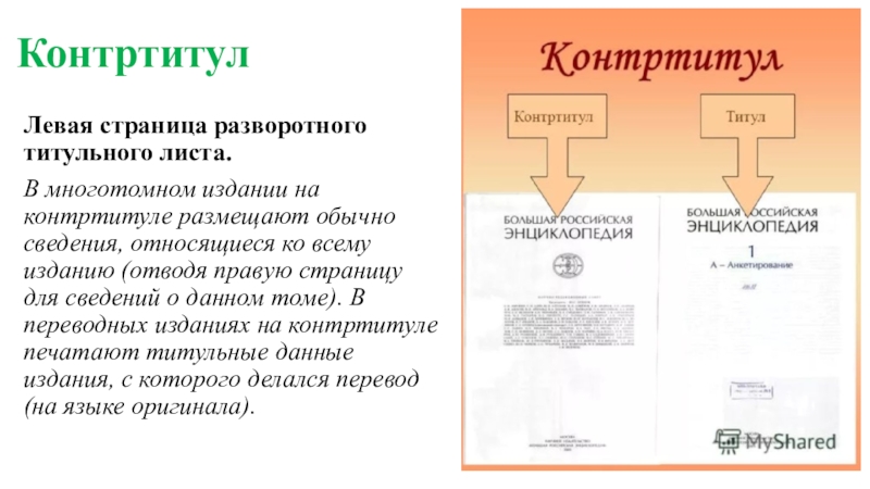 обычно сведения, относящиеся ко всему изданию (отводя правую страницу для сведений о данном томе). В переводных изданиях на контртитуле печатают титульные данные издания, с которого делался перевод (на языке оригинала).