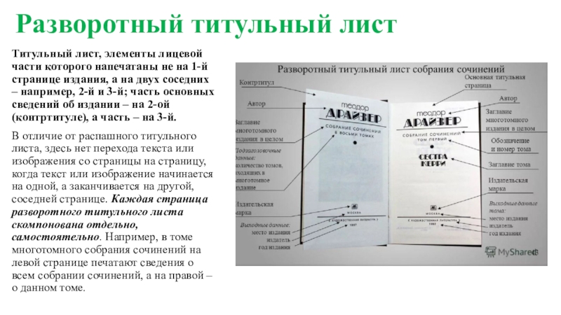 В отличие от распашного титульного листа, здесь нет перехода текста или изображения со страницы на страницу, когда текст или изображение начинается на одной, а заканчивается на другой, соседней странице. Каждая страница разворотного титульного листа скомпонована отдельно, самостоятельно. Например, в томе многотомного собрания сочинений на левой странице печатают сведения о всем собрании сочинений, а на правой – о данном томе.