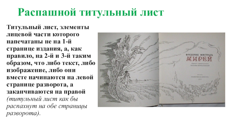 1-й странице издания, а, как правило, на 2-й и 3-й таким образом, что либо текст, либо изображение, либо они вместе начинаются на левой странице разворота, а заканчиваются на правой (титульный лист как бы распахнут на обе страницы разворота).