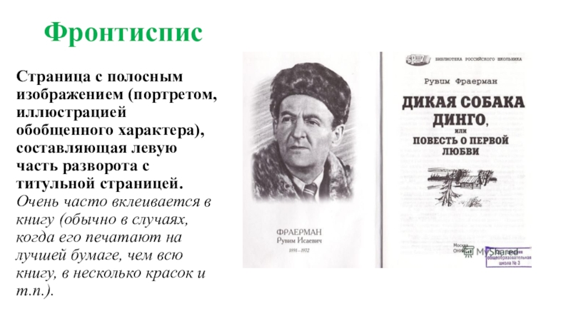 разворота с титульной страницей. Очень часто вклеивается в книгу (обычно в случаях, когда его печатают на лучшей бумаге, чем всю книгу, в несколько красок и т.п.).