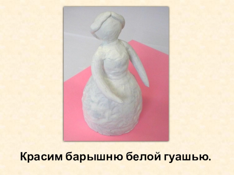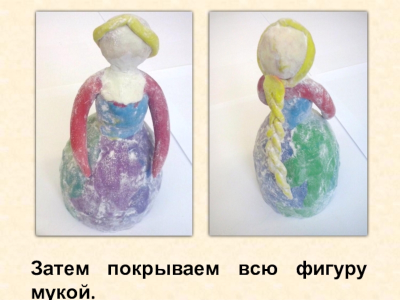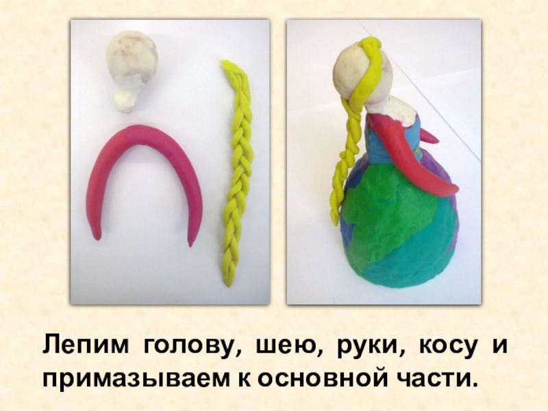 Слайд 5Лепим голову, шею, руки, косу и примазываем к основной части.