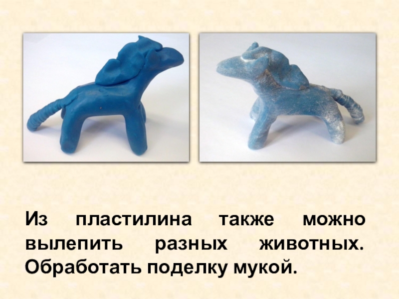 Слайд 11Из пластилина также можно вылепить разных животных. Обработать поделку мукой.