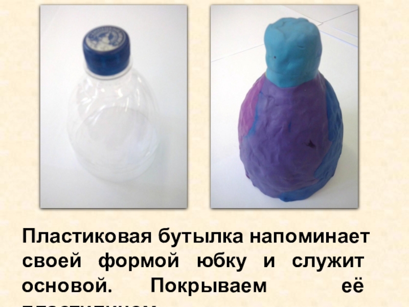 Слайд 4Пластиковая бутылка напоминает своей формой юбку и служит основой. Покрываем её