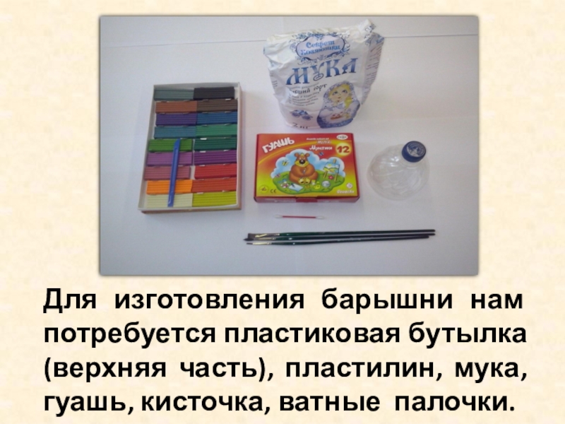 Слайд 3Для изготовления барышни нам потребуется пластиковая бутылка (верхняя часть), пластилин, мука,