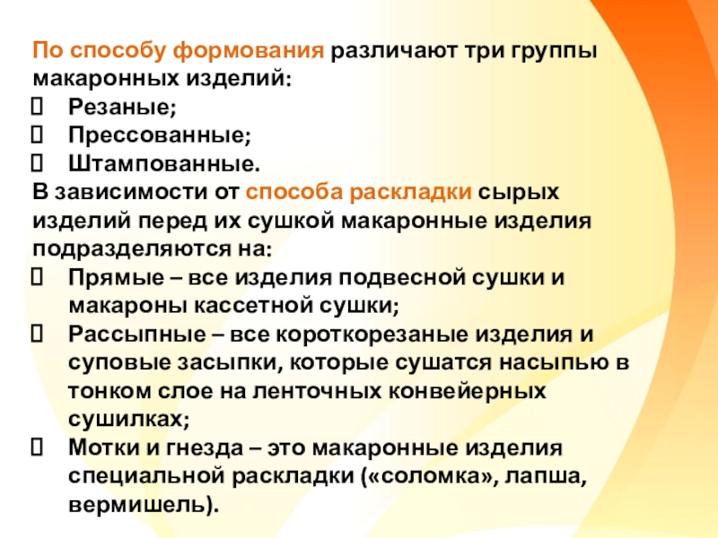 В зависимости от качества и сорта муки макаронные изделия подразделяют на группы — А, Б, В и классы 1-й и 2-й.