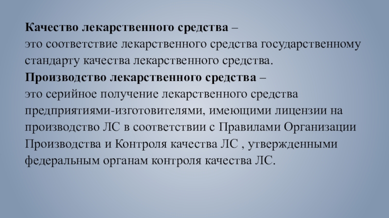это серийное получение лекарственного средства предприятиями-изготовителями, имеющими лицензии на производство ЛС в соответствии с Правилами Организации Производства и Контроля качества ЛС , утвержденными федеральным органам контроля качества ЛС.