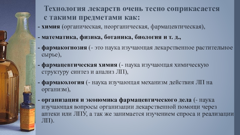 Слайд 6Технология лекарств очень тесно соприкасается с такими предметами как: