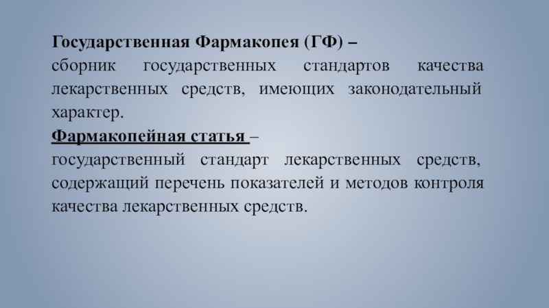 государственный стандарт лекарственных средств, содержащий перечень показателей и методов контроля качества лекарственных средств.