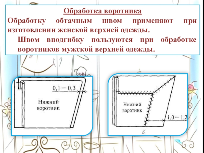 Вторую строчку прокладывают косыми стежками на расстоянии 1,0—1,5 см от уравненных срезов концов и отлета воротника. Начинают строчку от левого конца воротника, выполняя посадку в концах воротника.