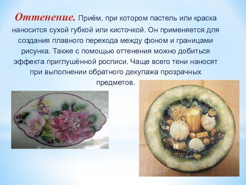 кисточкой. Он применяется для создания плавного перехода между фоном и границами рисунка. Также с помощью оттенения можно добиться эффекта приглушённой росписи. Чаще всего тени наносят при выполнении обратного декупажа прозрачных предметов.