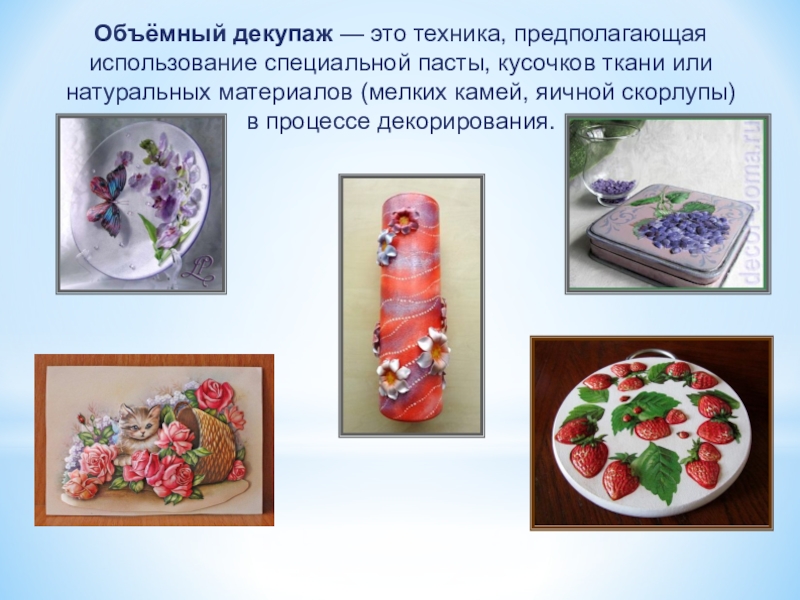 Слайд 12Объёмный декупаж — это техника, предполагающая использование специальной пасты, кусочков ткани