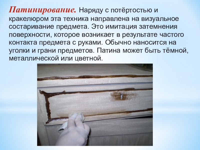 Слайд 19Патинирование. Наряду с потёртостью и кракелюром эта техника направлена на визуальное