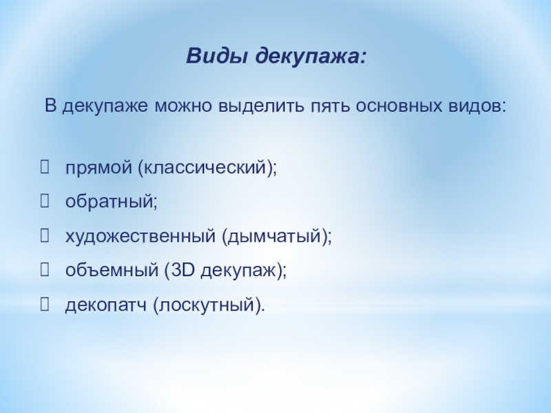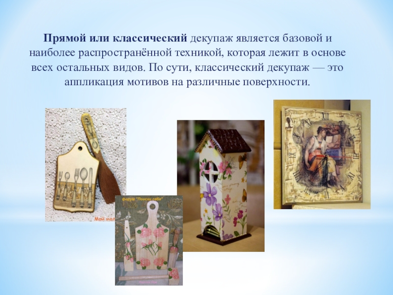 Слайд 9Прямой или классический декупаж является базовой и наиболее распространённой техникой, которая