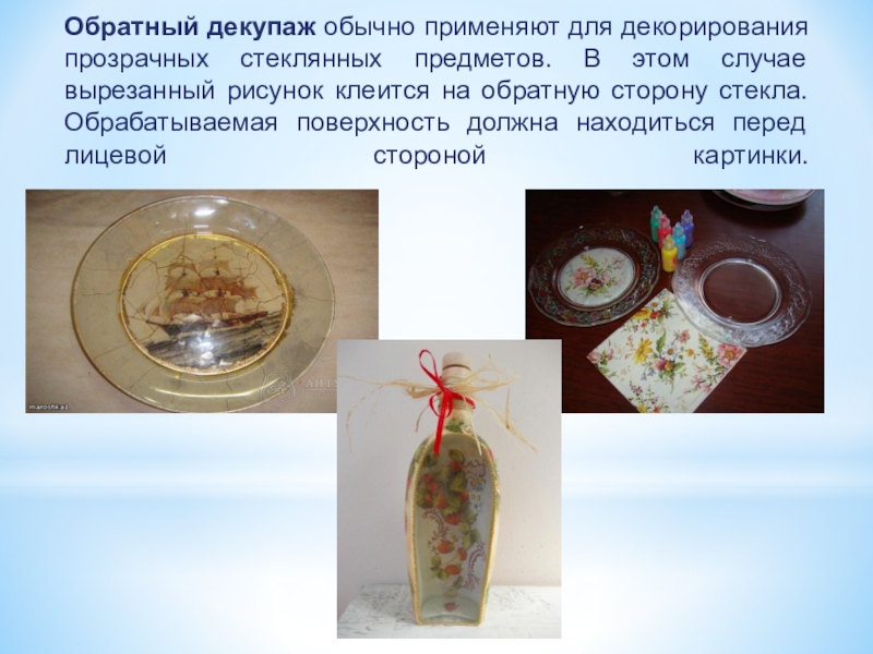 Слайд 10Обратный декупаж обычно применяют для декорирования прозрачных стеклянных предметов. В этом