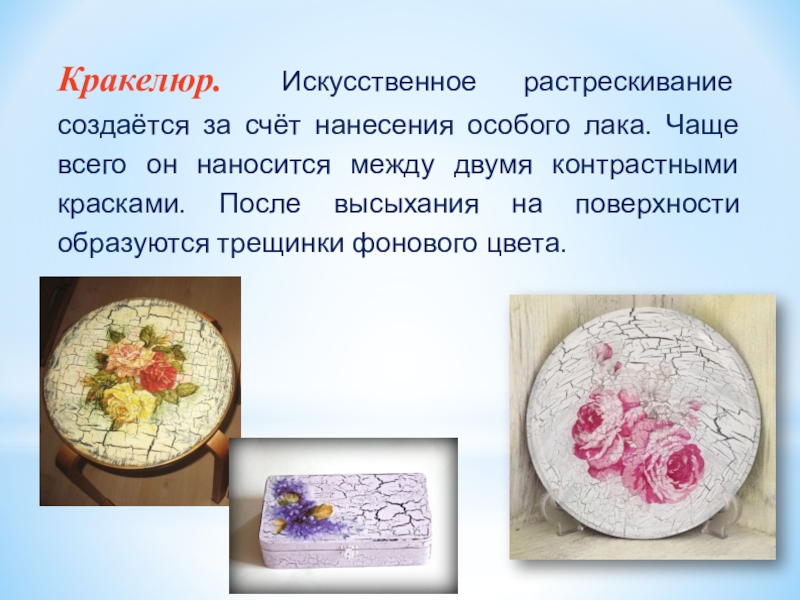 Слайд 18Кракелюр. Искусственное растрескивание создаётся за счёт нанесения особого лака. Чаще всего