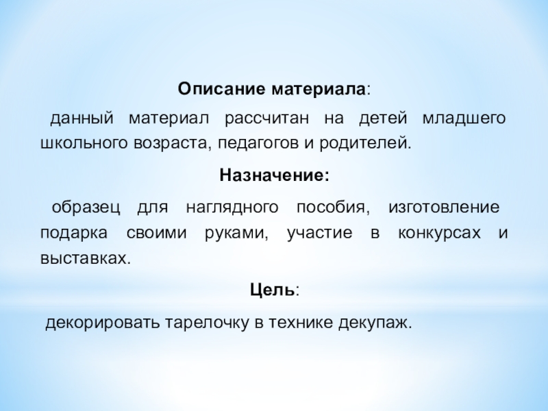 образец для наглядного пособия, изготовление подарка своими руками, участие в конкурсах и выставках.