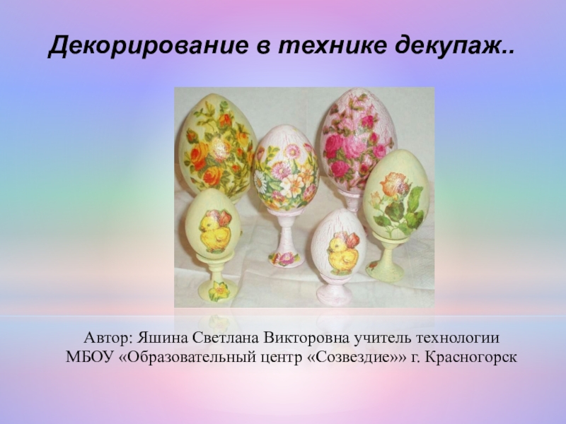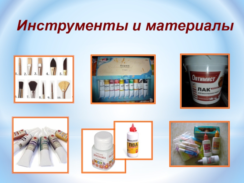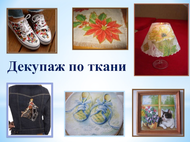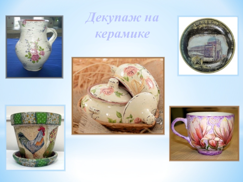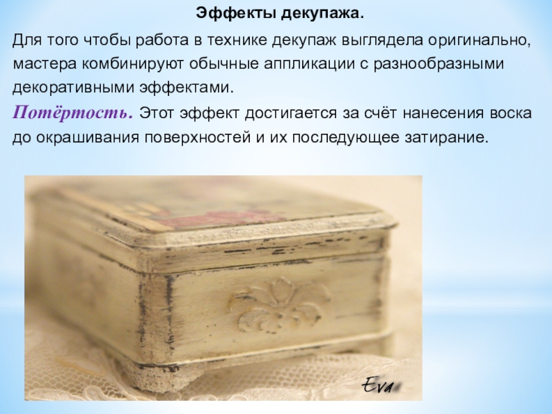 Слайд 11Художественный декупаж, который также называют дымчатым, предполагает комбинацию различных техник и