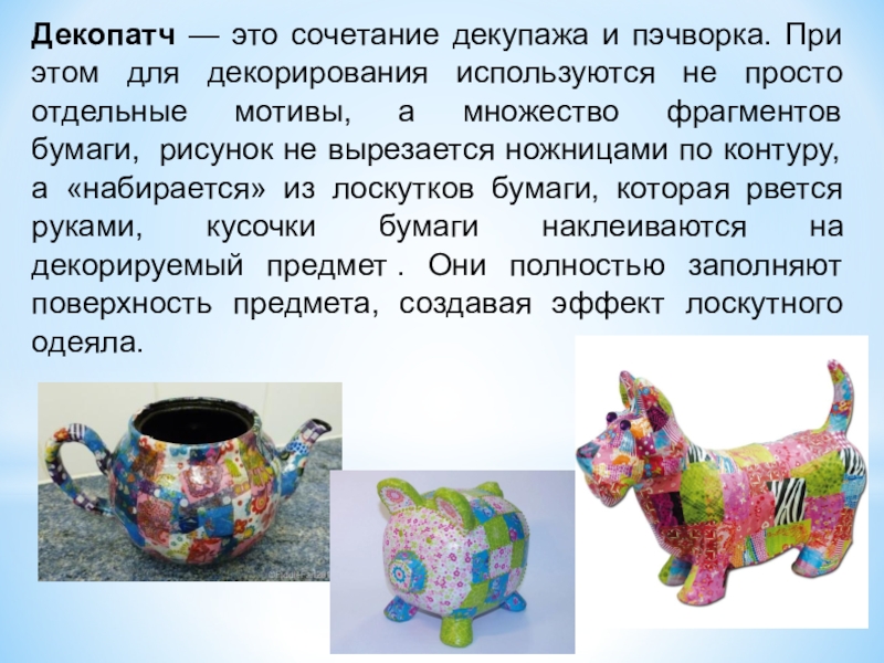 Слайд 13Декопатч — это сочетание декупажа и пэчворка. При этом для декорирования