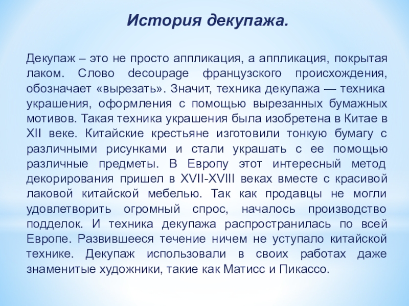 Слово decoupage французского происхождения, обозначает «вырезать». Значит, техника декупажа — техника украшения, оформления с помощью вырезанных бумажных мотивов. Такая техника украшения была изобретена в Китае в XII веке. Китайские крестьяне изготовили тонкую бумагу с различными рисунками и стали украшать с ее помощью различные предметы. В Европу этот интересный метод декорирования пришел в XVII-XVIII веках вместе с красивой лаковой китайской мебелью. Так как продавцы не могли удовлетворить огромный спрос, началось производство подделок. И техника декупажа распространилась по всей Европе. Развившееся течение ничем не уступало китайской технике. Декупаж использовали в своих работах даже знаменитые художники, такие как Матисс и Пикассо.