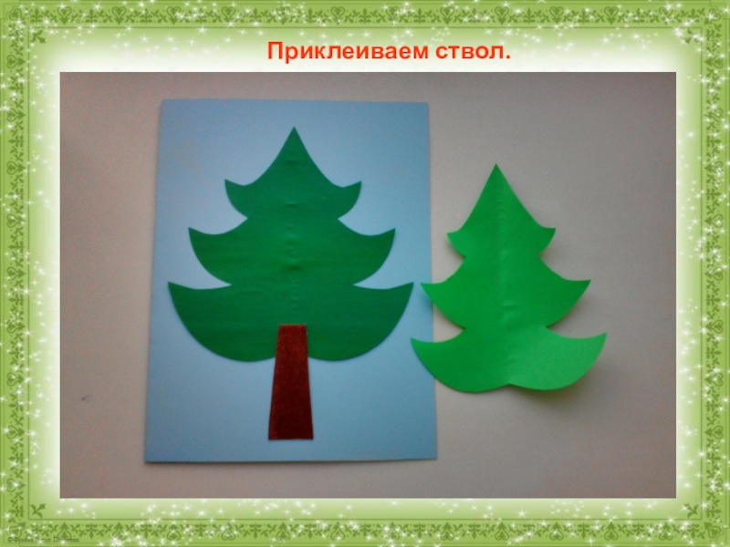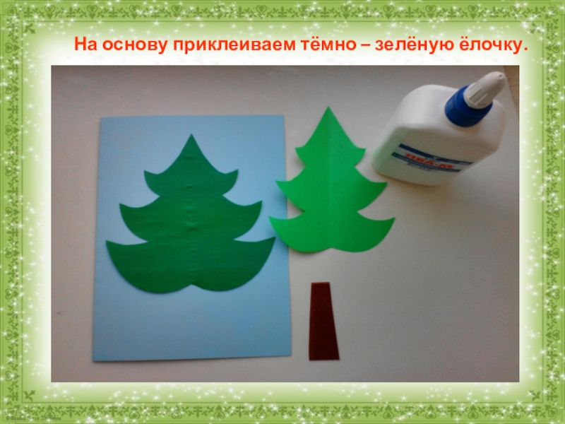 Слайд 5На основу приклеиваем тёмно – зелёную ёлочку.