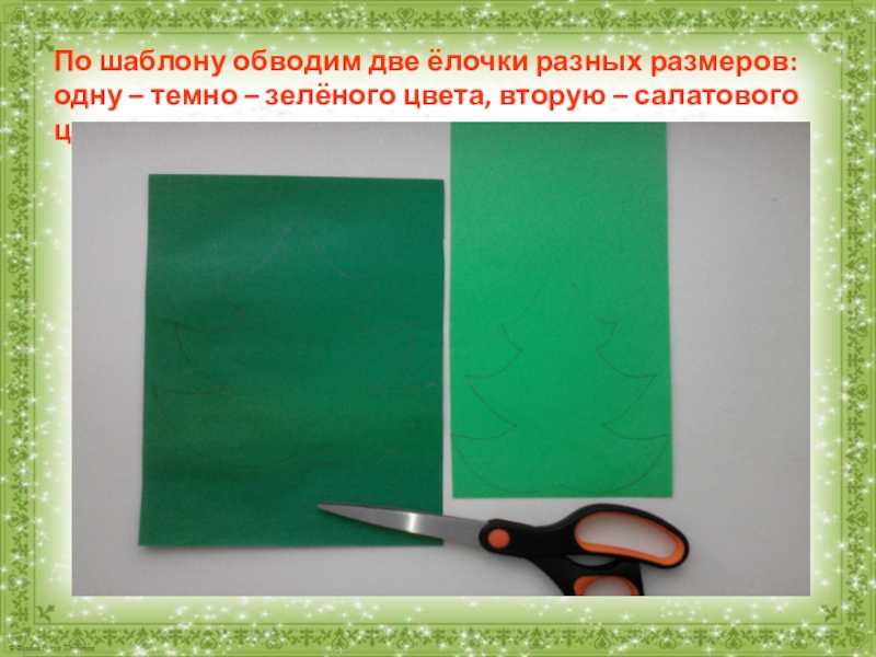 По шаблону обводим две ёлочки разных размеров: одну – темно – зелёного цвета, вторую – салатового цвета.