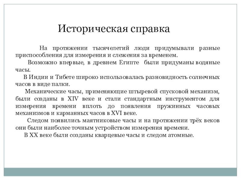 Историческая справка   На протяжении тысячелетий люди придумывали разные приспособления для измерения и слежения за временем.