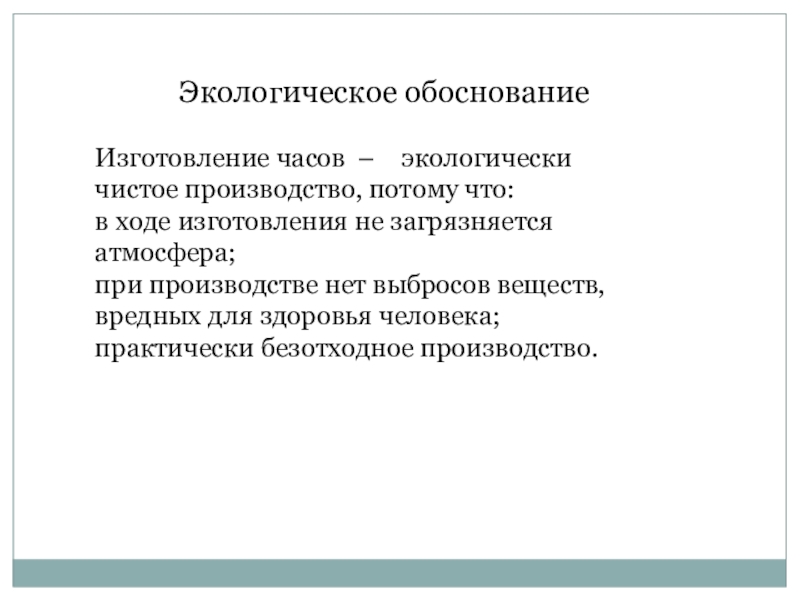 Экологическое обоснование Изготовление часов –  экологически чистое производство, потому что: в ходе изготовления не загрязняется атмосфера;при