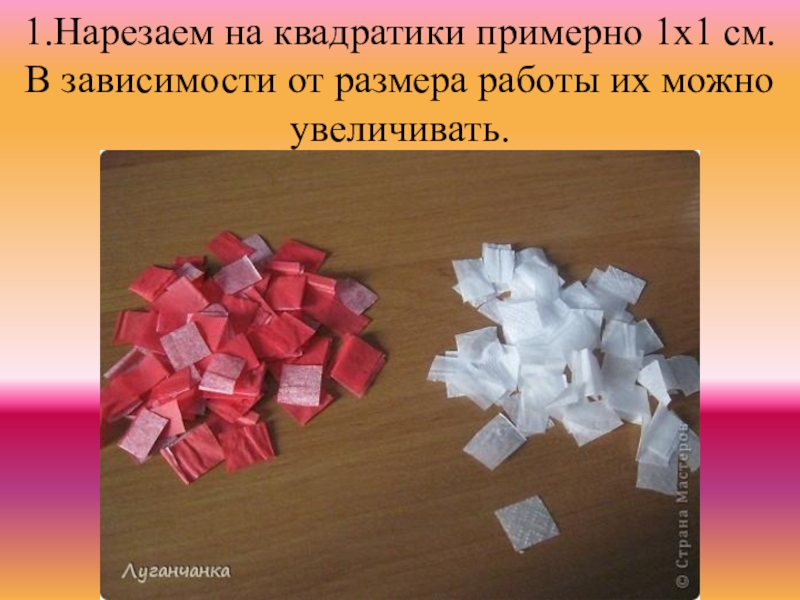 Слайд 51.Нарезаем на квадратики примерно 1х1 см. В зависимости от размера работы