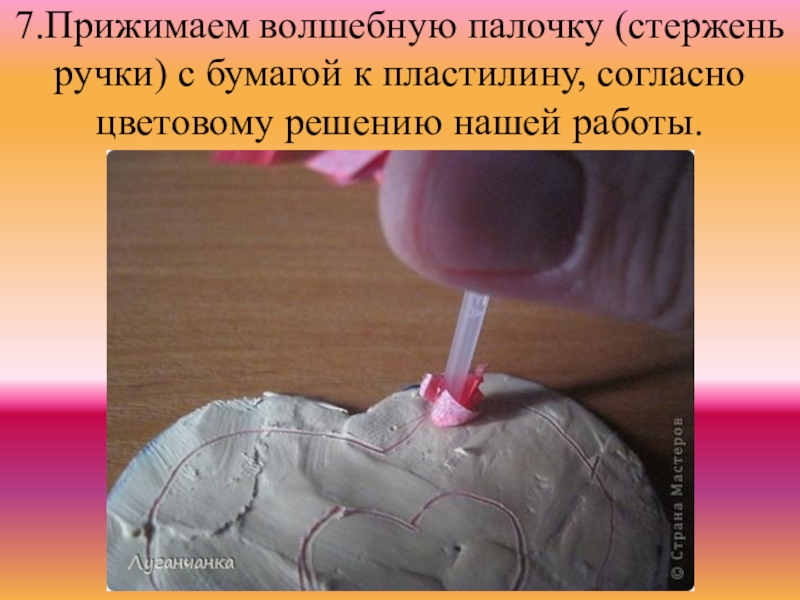 7.Прижимаем волшебную палочку (стержень ручки) с бумагой к пластилину, согласно цветовому решению нашей работы.