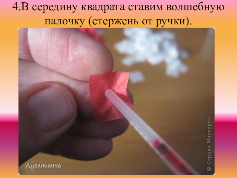 Слайд 74.В середину квадрата ставим волшебную палочку (стержень от ручки).