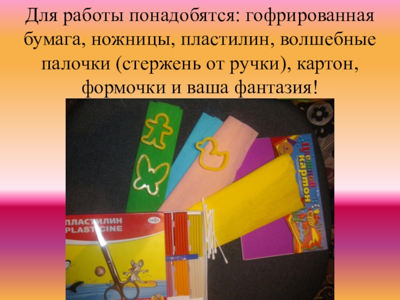 Слайд 4Для работы понадобятся: гофрированная бумага, ножницы, пластилин, волшебные палочки (стержень от