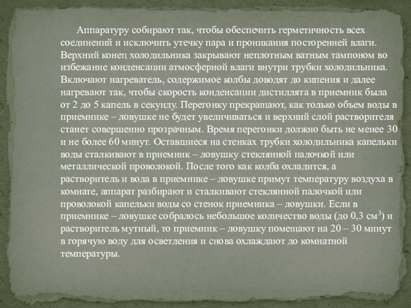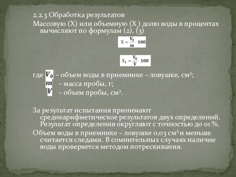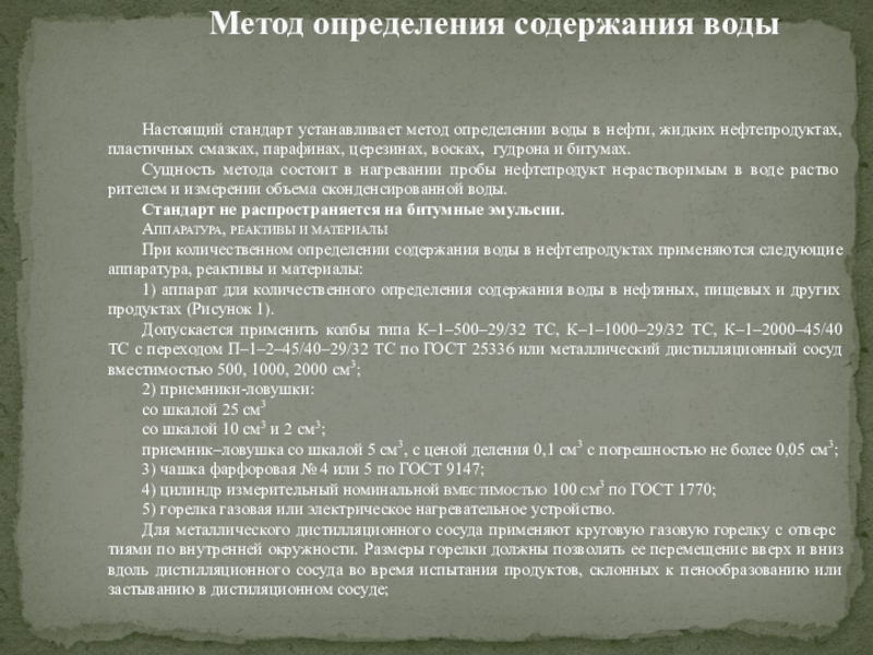 Сущность метода состоит в нагревании пробы нефтепродукт нерастворимым в воде растворителем и измерении объема сконденсированной воды.