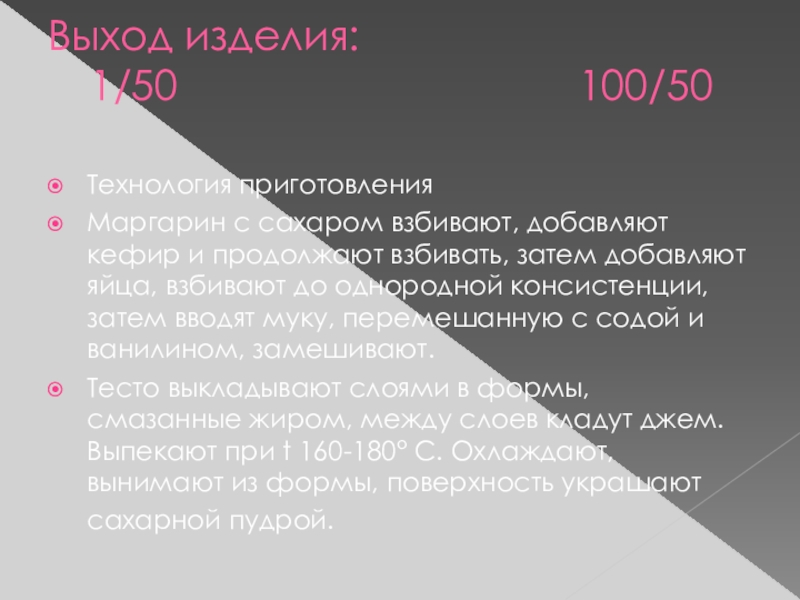 Тесто выкладывают слоями в формы, смазанные жиром, между слоев кладут джем. Выпекают при t 160-180° С. Охлаждают, вынимают из формы, поверхность украшают сахарной пудрой.