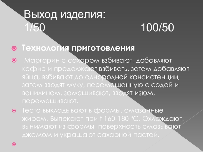 Тесто выкладывают в формы, смазанные жиром. Выпекают при t 160-180 °С. Охлаждают, вынимают из формы, поверхность смазывают джемом и украшают сахарной пастой.